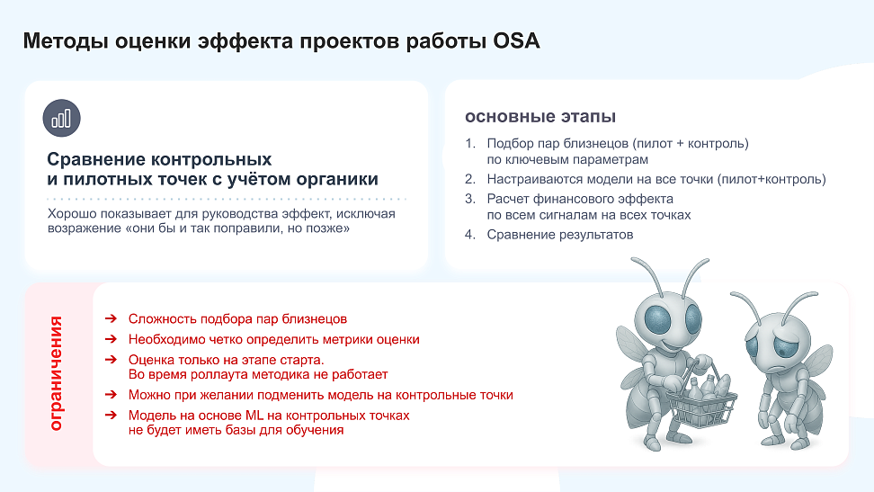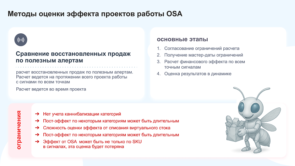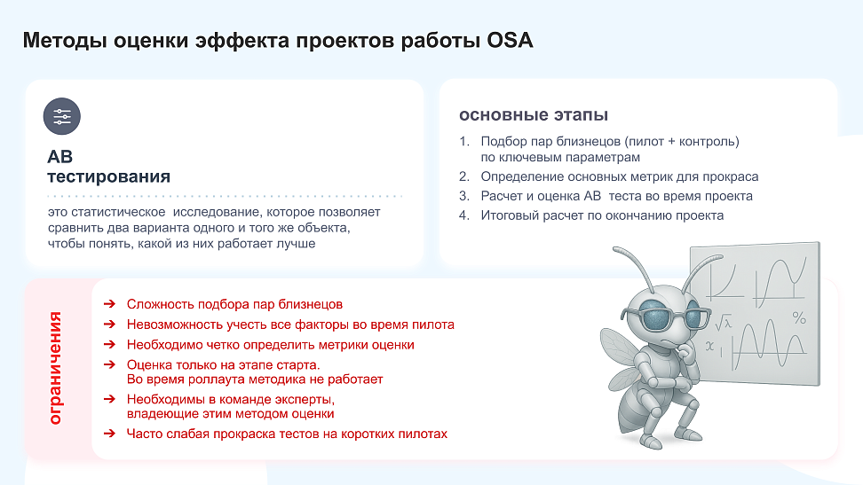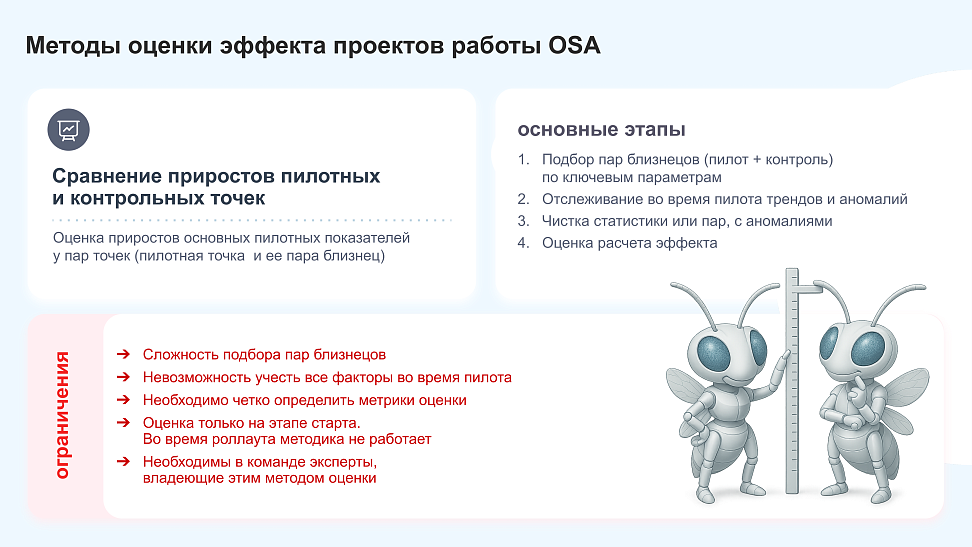 Сейчас существует несколько методик оценки эффективности работы с OSA и зависят они от того, на какой стадии проект находится – пилотирование или уже рутинная работа.