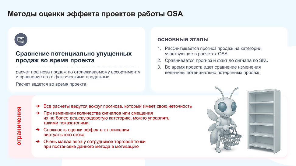 Когда мы говорим о работе с OSA непосредственно в магазине – это не просто НЕпустая полка, это оптимальное количество товара, правильные ценники, проверенные сроки годности, аккуратная выкладка – абсолютно все эти параметры влияют на решение о покупке.